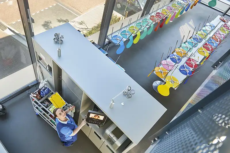 "Er komen steeds meer dingen bij die je helemaal zelfstandig kunt doen. Zoals de koffieautomaten schoonmaken en bijvullen. Dan kun je niet alleen met de schoonmaakkar, maar ook met de koffiekar op pad."