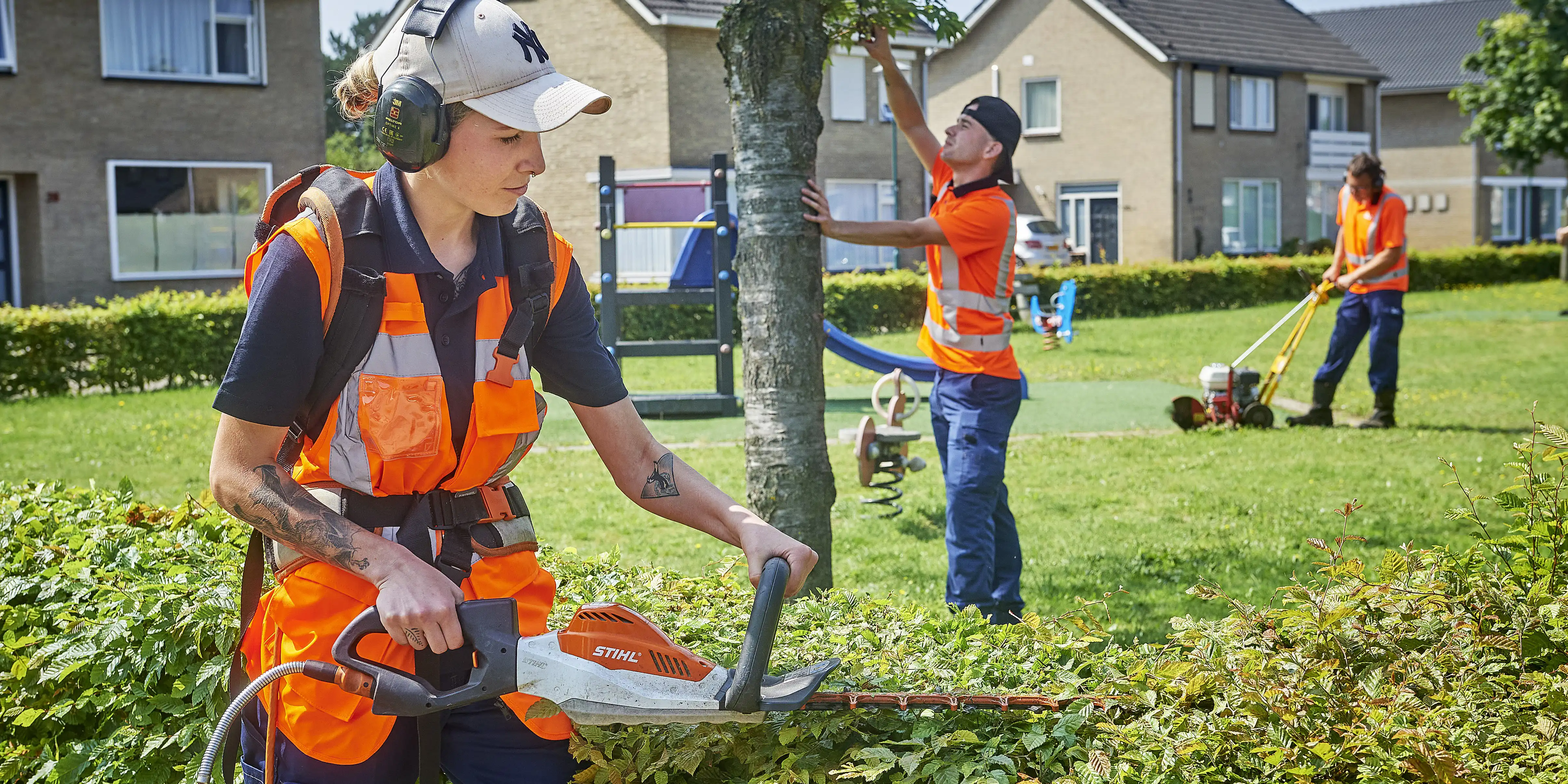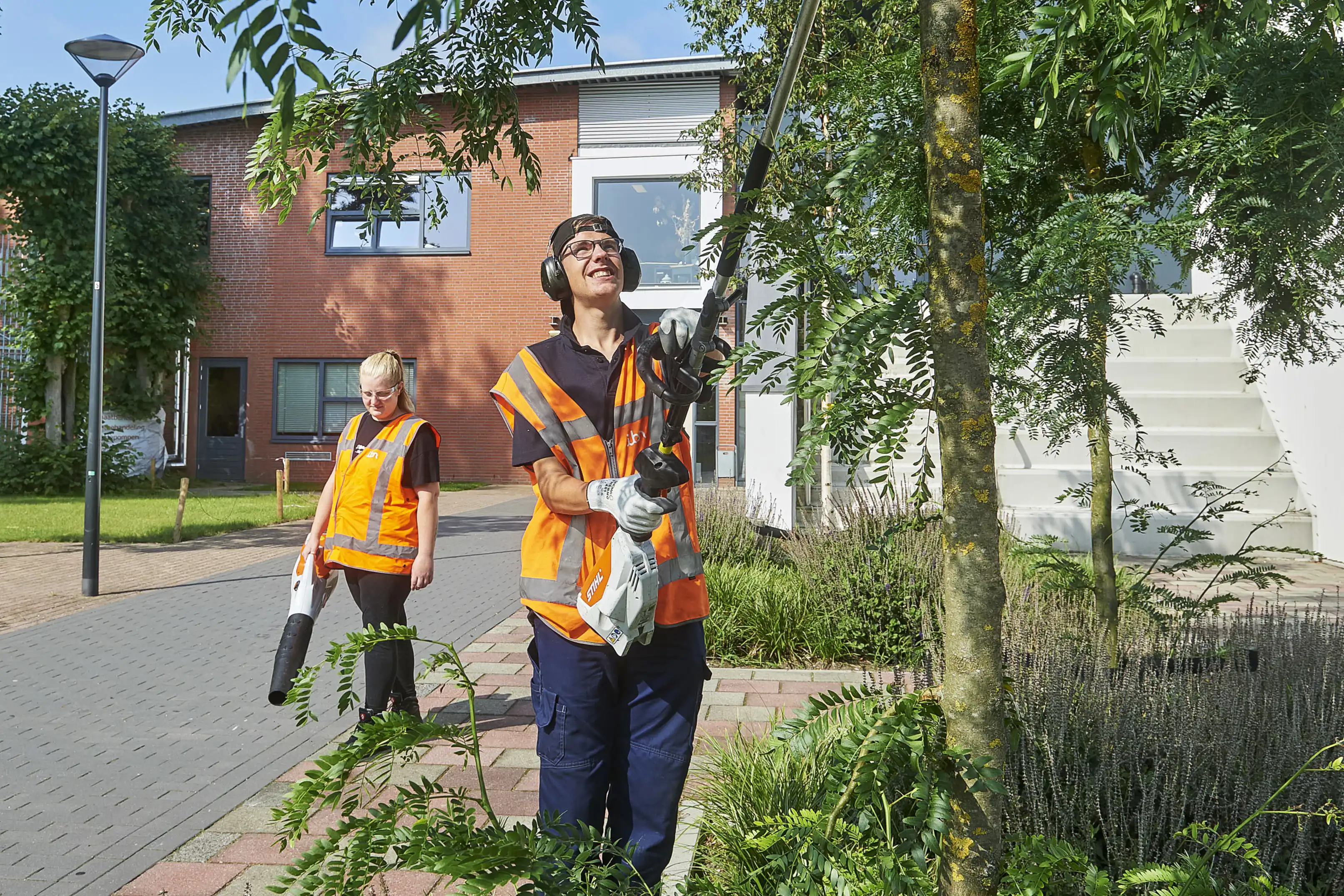 In het groen voer je allerlei groenwerkzaamheden uit. Van het onderhoud van de plantsoenen in de gemeente tot het vegen van paden en het opruimen van afval. Maar ook het schoffelen van de perken in je eigen regio tot het werken met de motorzaag, kettingzaag, grasmaaier en bosmaaier horen bij het werken in het groen. Moeten er bomen worden gesnoeid en hagen geknipt? Of zijn er werkzaamheden in de hoogte? Ook dan worden de medewerkers van het groen bij IBN ingeschakeld.